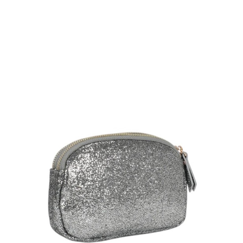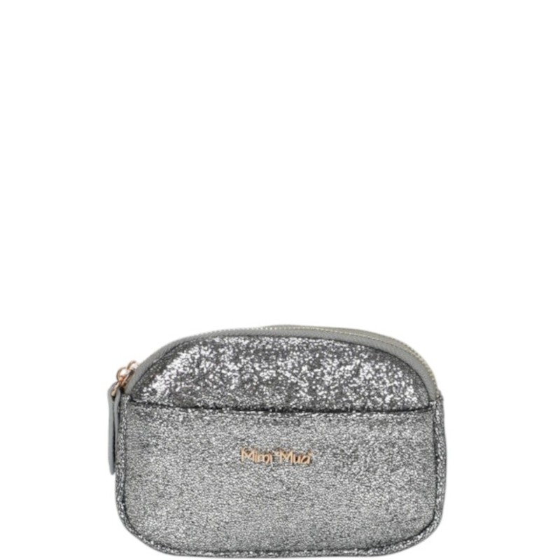 Portamonete Mimi-Mua stondato con finitura glitterata, pratico e luminoso, ideale in saldo. Misure: 15x3x10cm
